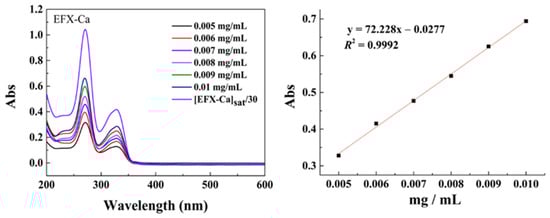 The water solubility of EFX-Ca at room temperature was determined by the Lambert–Beer law based on the standard line of the water solubility of EFX-Ca derived from a series of determined concentrations. The concentration of the working solution of EFX-Ca indicated by the UV-Vis spectrum was based on a 30× dilution on the saturated aqueous solution of EFX-Ca.