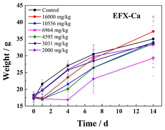 The time-dependent effects on the body weight of the tested KM mice after the oral administration of EFX-Ca at different dosages (2000, 3031, 4595, 6964, 10,556 and 16,000 mg/kg).