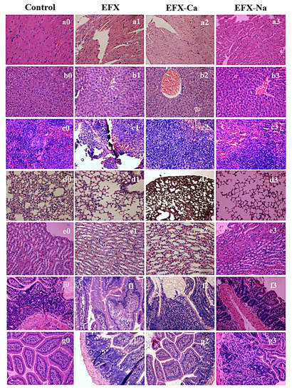 Histopathological images under 40× magnification on the main organs from the dead mice after the oral administration of EFX, EFX-Na, and EFX-Ca, in which the histologic tissue slices of (a) heart, (b) liver, (c) spleen, (d) lung, (e) kidney, (f) large intestine, and (g) small intestine were stained and visualized. Number 0, 1, 2, 3 indicates the effect of EFX, EFX-Ca and EFX-Na for each organ, respectively.