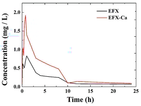 The relationship between drug concentration and the elimination time in plasma samples from the tested SD rats treated with EFX-Ca and EFX at different time points (0, 0.083, 0.333, 0.5, 0.75, 1, 3, 4, 6, 8, 10, 12, and 24 h).
