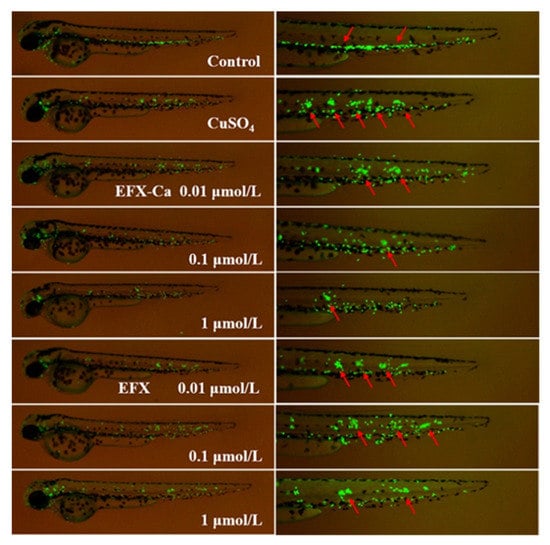 The transgenic zebrafish line Tg(mpx:eGFP) with green fluorescence at 3 dpf (day post fertilization) were primarily used for the anti-inflammation evaluation effect of EFX-Ca. This zebrafish model was set and induced by 40 min of incubation of 10 μM of CuSO4. Before the CuSO4-induced model was build, the Tg(mpx:eGFP) zebrafish were primarily incubated with different concentrations of EFX-Ca, also in comparison with EFX for 1 h, of 0.01, 0.1 and 1 μM, respectively, based on the above results of preliminary acute toxicity evaluation. The ROS production induced by CuSO4 in zebrafish could then be probed and visualized by the migration and aggregation on those labeled neutrophils. The zebrafish were also photographed under the stereo microscope.