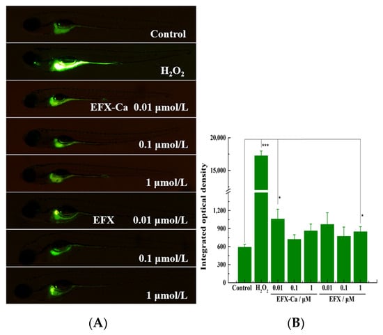 (A) The anti-inflammatory effect of EFX-Ca, compared with EFX at the same concentrations (0.01, 0.1, 1 μM), on the H2O2-induced ROS production in zebrafish model, indicated by the green fluorescence probe and visualized by the added DCFH-DA. (B) The quantitative results for the oxidative stress in zebrafish, represented by the histogram on the right side, were statistically analyzed based on examining the integrated optical density (IOD) of the green fluorescence in the tested zebrafish. Mean ± SD: * p < 0.05, *** p < 0.001.