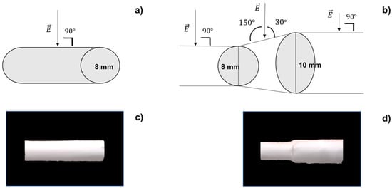 (a) Cylindrical mandrel surface perpendicular to electric field; (b) asymmetrical mandrel junction not perpendicular to electric field; (c) polymeric cylindrical scaffold; (d) polymeric asymmetrical scaffold.