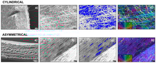 SEM analysis was conducted on polymeric scaffolds to evaluate the following parameters: fiber diameters (nm), matrix pore areas (nm2) and porosity % per unit surface area, and fiber orientation (°). Zeiss EVO MA10 apparatus (Carl Zeiss, Oberkochen, Germany) was used. Analyses were performed at the following magnifications: 1.00 kX, 2.50 kX, and 300 kX. Both cylindrical and asymmetrical scaffolds were analyzed. The resulting images were processed by ImageJ software (open-source image processing program designed for scientific multidimensional images—National Institutes of Health, Bethesda, MD, USA) using DiameterJ (DiameterJ v1.018 ImageJ software, USA) and OrientationJ (OrientationJ_.jar ImageJ software, USA) plugins in order to achieve data of fiber size, porosity, and orientation [23].