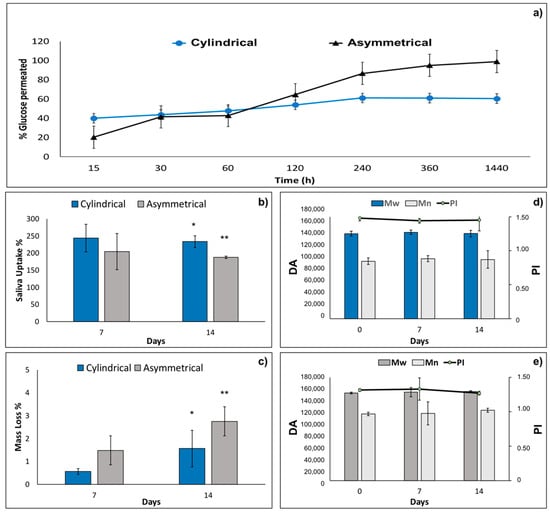 (a) Results 180 Da permeability test performed on tubular and asymmetrical scaffolds at 37 °C in PBS (pH = 7.4). (b) Artificial saliva uptake %, (c) mass loss % of cylindrical and asymmetrical scaffolds after 7 and 14 days in incubation in artificial saliva at 37 °C. Molecular weight (Mw), molecular number (Mn), and polydispersity index (PI) variations after 7 days and 14 days in incubation with artificial saliva for (d) cylindrical scaffold and (e) and asymmetrical scaffold. Data are presented as mean ± SD, * p < 0.05; ** 0.1 > p > 0.05.