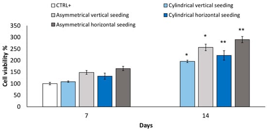 Cell viability % from the vertical seeding method was evaluated after 7 and 14 days for cylindrical and asymmetrical scaffolds. The results reported in Figure 4 show that asymmetrical scaffolds show a higher cell viability % (148 ± 8.6%) compared to CTRL+ and cylindrical scaffolds (108 ± 2.9%) after 7 days’ incubation. After 14 days’ incubation, a significant increase in cell proliferation is highlighted for both scaffolds, and the asymmetrical scaffolds confirmed the highest value of cell viability (256 ± 14%), either compared to CTRL+ and cylindrical scaffolds (195.7 ± 5.0%), respectively. In Figure 4, data of cell viability % obtained from horizontal seeding method are also reported. Cell viability % was evaluated after 7 and 14 days’ incubation for cylindrical and asymmetrical scaffolds. Compared to the control at 7 days, the asymmetrical patch shows an increase in cell viability % (164 ± 9.1%). After 14 days of incubation, the cell number duplicated corresponding to an increase of 289 ± 13% in cell viability % compared to 7 days’ CTRL+.