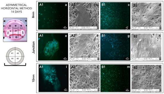DAPI staining (A1–B1) of asymmetrical patch cellularized by horizontal seeding method after 14 days of incubation. SEM analysis (A2–B2) of asymmetrical patch cellularized by horizontal seeding method after 14 days of incubation. (a) 8 mm A1 portion DAPI staining; (b) 8 mm A2 portion SEM image; (c) 8 mm B1 portion DAPI staining; (d) 8 mm B2 portion SEM image; (e) junction A1 portion DAPI staining; (f) junction A2 portion SEM image; (g) junction B1 portion DAPI staining; (h) junction B2 portion SEM image; (i) 10 mm A1 portion DAPI staining; (l) 10 mm A2 portion SEM image; (m) 10 mm B1 portion DAPI staining; (n) 10 mm B2 portion SEM image.