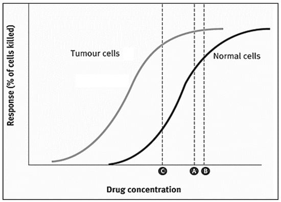 Dose responsive curve for chemotherapy drugs kills both tumor cells and healthy cells. The therapeutic dose (A) is close to the toxic dose (B). It is not safe to give this drug at a therapeutic dose. A safe dose (C) is chosen for administration to patients. Reproduced with permission from [14], Elsevier, 2008.