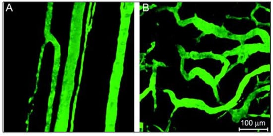 (A) a normal vascular network where the vessels are parallel-aligned next to each other; (B) a tumoral vasculature with chaotic defective arrangement. Adapted with permission from [37], Oxford University Press, 2006.