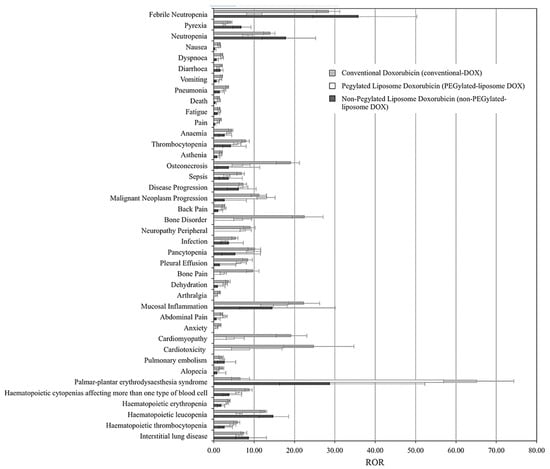 Summary of ROR of conventional, PEGylated, and non-PEGylated liposomal DOX in the FAERS database. (High resolution image at https://doi.org/10.1371/journal.pone.0185654.g002 accessed on 3 January 2022). Adapted from [75], PLOS, 2017.