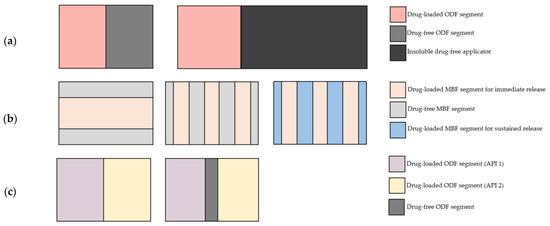 Conceptualization of different tandem films and their possible applications: (a) applicator films, (b) optimization of dissolution rate and (c) optimization of stability in the case of incompatible APIs.