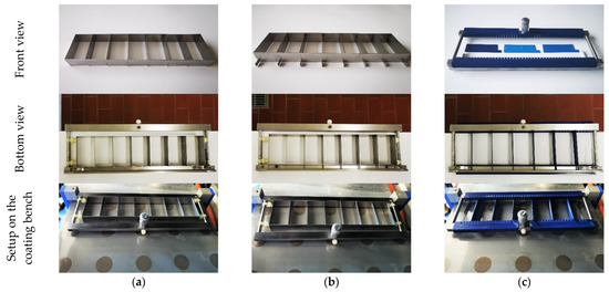 Comparison of the insert types in the front and bottom views and installed on the coating bench: (a) precursor steel model, (b) optimized steel model and (c) 3D-printed model.
