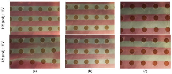 Photographies of the placebo tandem films cast of higher viscous (HV) and lower viscous (LV) HPMC solutions with the three insert models. The visible circles are for vacuum extraction. The films were cast with a (a) precursor steel model, (b) optimized steel model and (c) 3D-printed PLA model.