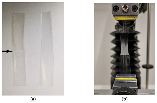 (a) Cut-to-size strips for tensile testing (left: HPMC + HPC, arrow marks the polymer junction, right: HPC) and (b) tandem film during the measurement.