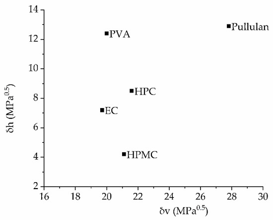 Hence, the volume-dependent solubility parameter δv is a simplification that includes both the disperse and polar group contributions. It was used for visualization of the solubility properties of molecules in a two-dimensional graph, which is called the Bagley diagram [32]. For further details, such as the group contribution parameter set, we refer to [31]. The molar weights for the calculations were as follows: 35,000–135,000 for HPMC, 100,000 for HPC, 200,000–600,000 for pullulan and 140,000 for EC [33,34,35,36,37]. A total of 500–5000 repetitive units were assumed for PVA [38], giving a molecular weight of 24,600–245,300.