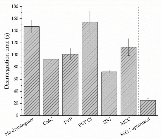 The disintegration times of the evaluated bisoprolol-loaded pre-formulations and the optimized formulation can be seen in Figure 8. All disintegrants, except for PVP Cl, reduced the mean disintegration time and the SSG film exhibited the fastest disintegration. However, the mean disintegration time of 73 s was still considered too high. Although there is no uniform method or specification for the determination of the disintegration time of ODFs, a limit of 30 s (as it is recommended for orodispersible tablets by the FDA [63]) is often applied [64]. Changes in the formulation, such as the reduction of the HPMC quantity or its molecular weight, led to a reduced disintegration time but resulted in brittle films that were considered unsuitable for further use (not shown). In the optimized SSG film, air was selectively introduced through rapid stirring (overhead stirrer with spiral attachment, 1000 rpm, 2 min), which resulted in a porous film with an improved disintegration time. Due to the higher volume and lower density of the pre-casting solution, the bisoprolol content in the formulation had to be adapted in order to obtain the target dose of 5 mg/4 cm2. The optimized SSG formulation exhibited a sufficient folding endurance of >10, as well as a disintegration time of <30 s.