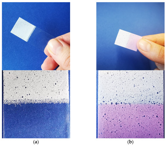 Applicator films with a (a) water-insoluble EC applicator and (b) water-soluble PVA applicator. The pictures were taken in front of a blue background.