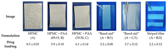 Films containing PAA as an enhancer of mucoadhesion had a lower theophylline load per 6 cm2 film compared with the formulation based on HPMC, presumably due to their higher resulting viscosities. Increasing viscosities of the pre-casting masses are known to lead to a higher deviation between the gap height and the actual wet film thickness, which reduces the drug load [66]. For the tandem films, the resulting surface of the drug-loaded film was reduced to 3 cm2. It was observed that the “stripe” shape led to a smaller drug load compared with the “band-aid” shape, which cannot be explained only by the space occupied by the coating knife insert. Instead, it can be assumed that the sticking of the pre-casting mass to the insert and resulting capillary forces between the subdivisions led to a lower thickness and, consequently, to a lower drug load. These effects should be considered and can be overcome by adapting the blade height of the coating knife.
