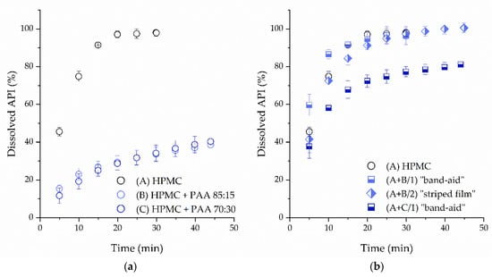 The addition of PAA as an enhancer for mucoadhesion led to a slower dissolution profile in the one-compartmental buccal films (Figure 11), which is disadvantageous when a rapid onset of action is desired. Less than 50% of the API was dissolved within 45 min. Decreasing the amount of PAA in the formulation (formulation B) did not improve the dissolution rate.