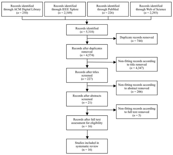 The procedure that was followed for the selection of studies is presented in Figure 1. The 5318 initial records, which were identified through an inclusive search strategy, were assessed for the presence of duplicate publications. Consequently, 744 duplicate results were identified and omitted. Therefore, the literature search yielded 4574 unique studies. According to the thorough study selection strategy described in Section 3.2, the first selection phase identified 4347 irrelevant studies to be excluded. In the second phase, the remaining 227 results were screened by reading the abstract; 206 irrelevant studies were omitted. For example, studies were excluded when not mentioning “adverse effects of drug treatment” or other related but rather general terms such as “drug reviews” in the abstract. In the third phase, the full text of the remaining 21 publications was read. Five studies were considered irrelevant because they did not investigate the application of computational linguistics to understand text, with the purpose of public health monitoring or public health surveillance within the discipline of pharmacovigilance.