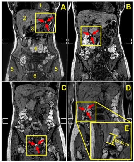 One of the first studies, conducted by Schiller et al., applied MRI to investigate the simultaneous passage of non-disintegrating oral formulations and quantify the fluid presence in the intestines in the fasted and fed state. The study concluded that fluid presence remains mainly unchanged in the colon in both fasted and fed states and introduced the concept of gastrointestinal tract fluid pockets, which increase in numbers after food administration. The study was able to locate the oral formulation tested (capsules 16.8 mm in length and 4.6 mm in diameter) and link movement of these non-disintegrating gel capsules to food intake []. Sager at al. took advantage of the superparamagnetic properties of incorporated iron oxide to visualize the transfer of immediate-release hard gelatin capsules in the GI tract []. Grimm et al. encapsulated dried pineapple and used MRI to monitor the behavior of acid-resistant capsules in vivo, exploiting the MRI contrast agent properties of the fruit on T1-weighted water imaging []. MRI has also been used in other studies to image formulations, but primarily in the upper GI tract, including non-disintegrating oral formulations, release of MRI contrast agents from capsules, multi-particulate surrogates and gadolinium-labelled liposomes [,,,,,,,,].