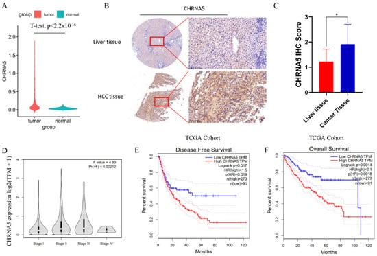 Increased expression of CHRNA5 in HCC. (A) Increased mRNA expression of CHRNA5 in HCC compared with that in normal liver tissue; (B,C) increased protein expression of CHRNA5 in HCC compared with that in normal liver tissue; (D) CHRNA5 mRNA expression level in HCC at different stages; (E,F) relationship between CHRNA5 expression and the prognosis of HCC patients. * p < 0.05.