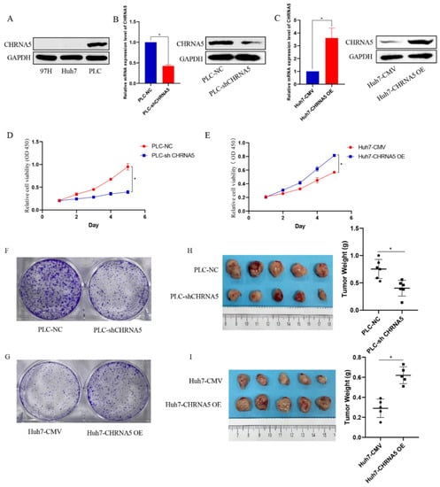 CHRNA5 regulates the proliferation ability of HCC cells. (A) The protein expression level of CHRNA5 in HCC cell lines, including MHCC-97H, Huh7, and PLC cells; (B) real-time qPCR and Western blot analysis of the knockdown efficiency of CHRNA5 in PLC cell lines; (C) real-time qPCR and Western blot analysis of the overexpression efficiency of CHRNA5 in Huh7 cell lines; (D) CCK8 assay of PLC-NC and PLC-sh CHRNA5 cell lines; (E) CCK8 assay of Huh7-CMV and Huh7-CHRNA5 OE cell lines; (F) colony formation assay of PLC-NC and PLC-sh CHRNA5 cell lines; (G) colony formation assay of Huh7-CMV and Huh7-CHRNA5 OE cell lines; (H) image of tumors from PLC-NC and PLC-sh CHRNA5 cell lines subcutaneously injected into mice and tumor weight; (I) image of tumors from Huh7-CMV and Huh7-CHRNA5 OE cell lines subcutaneously injected into mice and tumor weight. * p < 0.05.