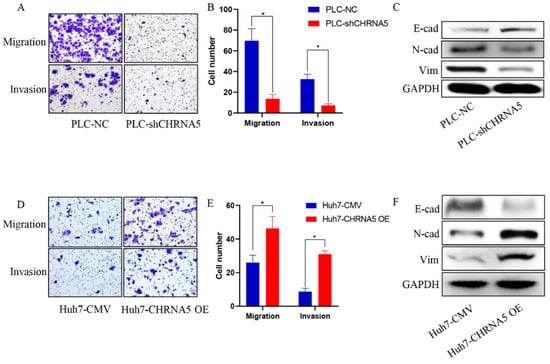 CHRNA5 promotes HCC migration and invasion via regulating EMT phenotype. (A,B) Effects of silencing CHRNA5 on HCC migration and invasion were determined by transwell assays; (C) effects of silencing CHRNA5 on expression of EMT-associated markers in HCC; (D,E) effects of CHRNA5 overexpression on HCC migration and invasion were determined by transwell assays; (F) effects of CHRNA5 overexpression on expression of EMT-associated markers in HCC. * p < 0.05.