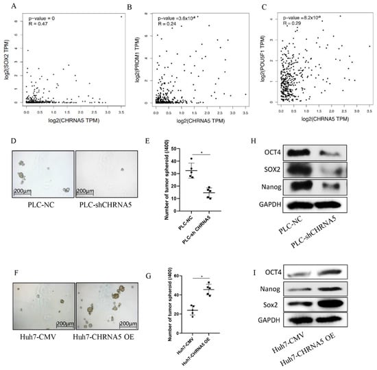 CHRNA5 promotes HCC spheroid formation ability via regulating stemness-associated genes. (A–C) Correlation between CHRNA5 mRNA expression level and stemness-associated genes in TCGA database; (D,E) effects of CHRNA5 silencing on HCC spheroid formation ability; (F,G) effects of CHRNA5 overexpression on HCC spheroid formation ability; (H) effects of CHRNA5 silencing on the expression of stemness-associated genes; (I) effects of CHRNA5 overexpression on the expression of stemness-associated genes. * p < 0.05.