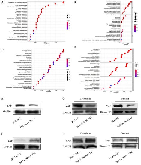 We used the online analysis tool LinkedOmics to identify genes that were significantly correlated with CHRNA5 in HCC. Genes negatively correlated with CHRNA5 (Figure 5A,B) and positively correlated with CHRNA5 (Figure 5C,D) were incorporated into KEGG and GO analyses. The results reveal that CHRNA5 is associated with many important cancer-related signaling pathways, such as cell cycle regulation, DNA replication, mismatch repair, and the Hippo signaling pathway in HCC. YAP is an important component of the Hippo signaling pathway and plays a critical role in pro-proliferation and anti-apoptosis []. To further check whether CHRNA5 can regulate the Hippo signaling pathway in HCC, we detected the YAP expression level after silencing or overexpressing CHRNA5. The results revealed that YAP expression was significantly downregulated after silencing CHRNA5 and markedly upregulated after overexpressing CHRNA5 in HCC cells (Figure 5E,F). The transcriptional activity of YAP was closely associated with its subcellular localization. Therefore, we further detected the YAP expression level in the cytoplasm and nucleus after CHRNA5 knockdown or overexpression. The results revealed that silencing CHRNA5 significantly inhibited the nuclear accumulation of YAP in the PLC cell line, and CHRNA5 overexpression markedly augmented YAP nuclear accumulation in the Huh7 cell line (Figure 5G,H), further suggesting that CHRNA5 has a critical role in regulating YAP activity.