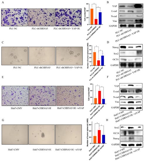 YAP plays an essential role in the contribution of CHRNA5 to malignant phenotype of HCC. (A) YAP overexpression partially rescued the inhibitory effect of silencing CHRNA5 on the migration ability of HCC cells; (B) YAP overexpression partially rescued the inhibitory effect of silencing CHRNA5 on the expression of EMT-associated markers; (C) YAP overexpression partially rescued the inhibitory effect of silencing CHRNA5 on the spheroid formation ability of HCC cells; (D) YAP overexpression partially rescued the inhibitory effect of silencing CHRNA5 on the expression of stemness-associated genes; (E) the inhibitory effect of silencing CHRNA5 on the migration ability of HCC cells was attenuated after overexpressing YAP; (F) the inhibitory effect of silencing CHRNA5 on the expression of EMT-associated markers in HCC cells was attenuated after overexpressing YAP; (G) the inhibitory effect of silencing CHRNA5 on the spheroid formation ability of HCC cells was attenuated after overexpressing YAP; (H) the inhibitory effect of silencing CHRNA5 on the expression of stemness-associated genes in HCC cells was attenuated after overexpressing YAP. * p < 0.05.