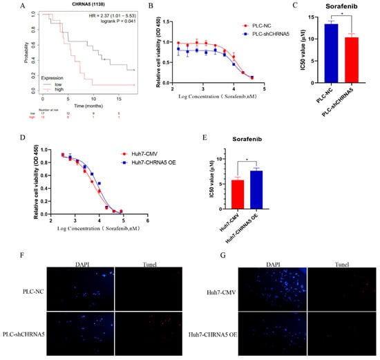 CHRNA5 regulates sorafenib sensitivity in HCC. (A) The effect of CHRNA5 on the OS of HCC patients receiving sorafenib treatment; (B,C) IC50 of sorafenib in PLC-NC and PLC-sh-CHRNA5 cell lines; (D,E) IC50 of sorafenib in Huh7-CMV and Huh7-CHRNA5 OE cell lines; (F) TUNEL detection of PLC-NC and PLC-shCHRNA5 cell lines treated with sorafenib; (G) TUNEL detection of Huh7-CMV and Huh7-CHRNA5 OE cell lines treated with sorafenib. * p < 0.05, + Censored Data.