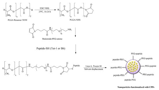 Conjugation of PEG and cell penetrating peptides (CPPs) to PLGA and preparation of Lico-A PLGA-PEG-CPP NPs.