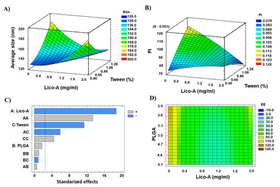 Data obtained was analyzed in order to observe the trends that Lico-A PLGA NPs follow. Regarding the Zav, it can be observed that low Lico-A concentrations are able to provide smaller NPs size (Figure 2A). Moreover, high PLGA amounts tend to slightly increase NPs Zav (Figure S2). This fact correlates with previous studies carried out using polymeric NPs where increased PLGA concentration causes higher Zav []. Moreover, Zav varies when low surfactant concentrations are used observing that at high surfactant amounts lower Zav is obtained. Importantly, even with low surfactant amounts, all the formulations obtained showed Zav below 200 nm. Moreover, increased amounts of Tween 80 favor lower PI values and, as observed for Zav, high Lico-A amounts tend to increase the PI (Figure 2B). Therefore, medium-low Lico-A concentrations will be used in order to reduce PI. Moreover, as can be observed in the Pareto chart, low amounts of Tween 80 also favor the EE (Figure 2C). Concerning this parameter, low Lico-A values tend to increase the EE (p < 0.05) (Figure 2D). This might be due to the fact that it is easier to encapsulate low amounts of drug, thus obtaining high EE values.