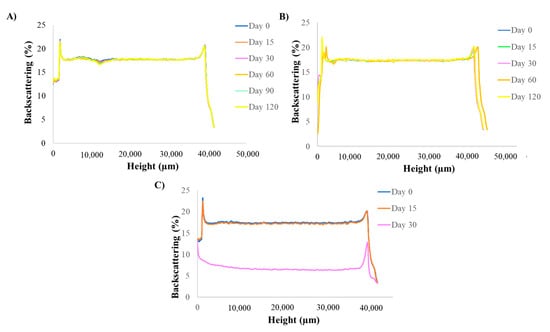 Turbiscan backcattering profile at different temperatures analyzed monthly. (A) 4 °C, (B) 25 °C and (C) 38 °C.