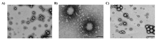 Transmission electron microscopical images of Lico-A NPs. (A) Lico-A-PLGA NPs (scale bar corresponds to 1 µm), (B) Lico-A PLGA-PEG-Tet-1 NPs (scale bar corresponds to 100 nm), and (C) Lico-A PLGA-PEG-B6 NPs (scale bar corresponds to 500 nm).