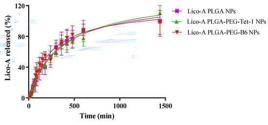 In order to study the release of Lico-A from Lico-A PLGA NPs, Lico-A PLGA-PEG-Tet1 NPs, and Lico-A PLGA-PEG-B6 NPs, a direct dialysis experiment was carried out. In all Lico-A NPs, an initial fast release corresponding to a burst effect of the Lico-A placed on the NPs surface followed by a sustained Lico-A release can be observed (Figure 5).