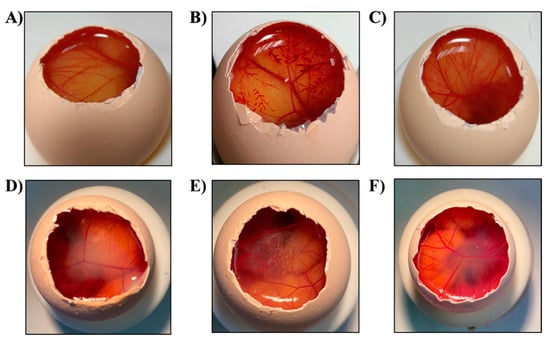 In order to assess the in vitro ocular tolerance, the HET-CAM (hen’s egg–chorioallantoic membrane) test was developed as described in the INVITTOX protocol No. 15 [,]. This method is based on the observation of the irritating effects (hemorrhage, vasoconstriction, and coagulation) that may appear during the first five minutes after the application of 300 μL of the studied formulation on the chorioallantoic membrane (CAM) of a 10-day embryonated egg. These eggs were kept at a temperature of 12 ± 1 °C for at least 24 h before placing them in the incubator with controlled temperature (37.8 °C) and humidity (50–60%) during the days of incubation []. Free Lico-A (dissolved in DMF:PEG 400:MQ Water; 1:49:50), Lico-A PLGA NPs, and Lico-A PLGA-PEG-CPP NPs were evaluated. Controls were created using SDS 1% (positive control for slow irritation), NaOH 0.1 N (positive control for rapid irritation), and NaCl 0.9% (negative control).