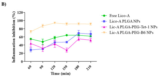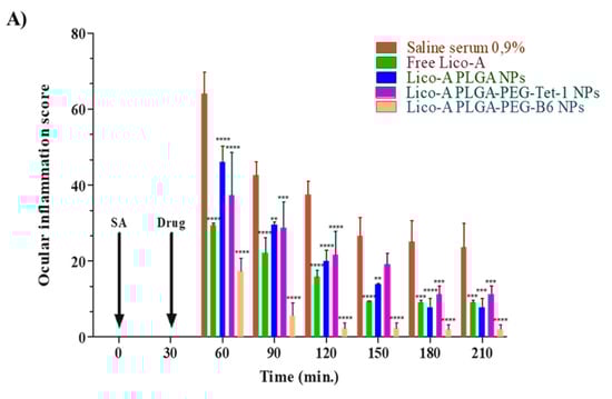 As can be observed in Figure 6, during the first timepoints, all of the Lico-A NPs and free Lico-A showed statistically significant differences against the control group (p < 0.001). This may be due to the potent Lico-A anti-inflammatory capacity previously reported by other groups and demonstrated here for ocular applications [,]. Among all the formulations, Lico-A PLGA-PEG-B6 NPs presented significantly increased anti-inflammatory activity compared to the other formulations and free Lico-A (Figure 7). This correlates with the faster initial Lico-A release obtained in vitro as well as with the fact that B6 peptide has a higher positive charge than Tet-1, thus increasing the interactions with negative ocular layers and allowing Lico-A enhanced penetration and therapeutic effects. Furthermore, Lico-A PLGA-PEG-B6 NPs also possess a smaller average size which may facilitate their cellular internalization and pharmacological effects []. Moreover, free Lico-A showed an initial superior activity compared to Lico-A PLGA NPs and Lico-A PLGA-PEG-Tet1 NPs but after 90 min no significant differences between the formulations were obtained. Moreover, all of the assessed formulations were able to reduce inflammation compared to the saline serum control in a significant manner, even after 210 min after the inflammation induction.