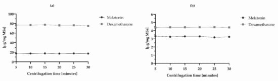 The modification of centrifugation time of the samples for EE and IVR quantitation was performed in four replicates to optimize drug extraction procedure and ensure their robust quantification. The centrifugation time was increased from 5 to 30 min successively, and the DX and MEL recoveries (%) were calculated every 5 min. Regarding the in vitro release assay, data were referred to 24-h release. Results (Table 9) demonstrated that there was no statistical significant difference between the measurements obtained over the six different centrifugation times, ergo “5 min” was the parameter selected as it was meaningless considering higher times in absence of significant values. Precisely, RSD of all determinations obtained by changing centrifugation times complied with acceptance criteria (RSD < 5%) for the two active ingredients of both the assays [40]. These results suggested that the DX and MEL extraction recoveries were reliable and reproducible (Figure 3).