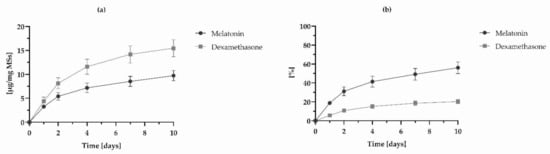 The encapsulation efficiency (EE) refers to the amount of drug successfully entrapped into the drug delivery device [34]. In this case, DX and MEL contents were calculated as the ratio between the actual drug amount and the total added during the elaboration of the microspheres. All samples were analysed in duplicate and the results were reported as the average ± standard deviation (SD).