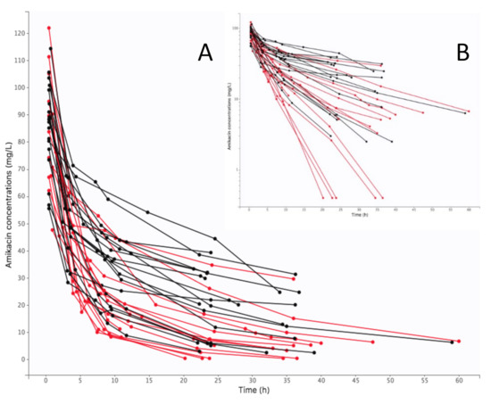 Individual concentration-time curves of amikacin in plasma (black color for V-A ECMO, red color for control): (A) arithmetic scale, (B) logarithmic scale.