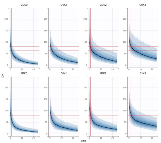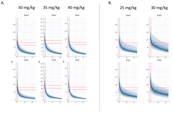 Dose simulations (A) at 35 mg/kg and 40 mg/kg in KDIGO stage 0 control (G0K0, top) and V-A ECMO (G1K0, bottom) patients vs. 30 mg/kg (B) at 25 mg/kg in KDIGO stage 3 control (G0K0, top) and V-A ECMO (G3K0, bottom) patients vs. 30 mg/kg.