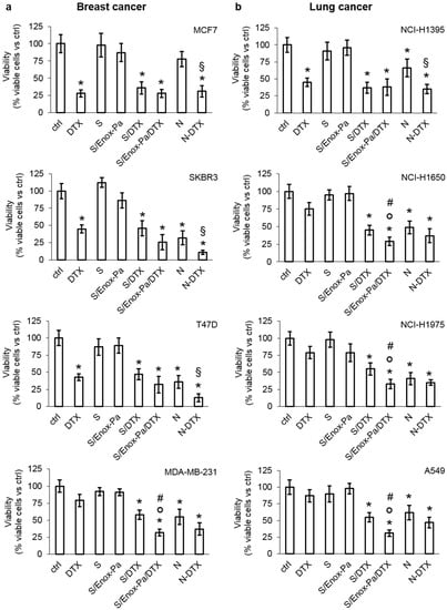 Viability of breast and non-small cell lung cancer cells treated with free docetaxel and different formulations of SEDDs. (a) Human breast MCF7, SKBR3, T47D, and MDA-MB-231 cells and (b) human non-small cell lung cancer NCI-H1395, NCI-H1650, NCI-H1975, and A549 cells were incubated for 72 h with fresh medium (ctrl), 80 µM free DTX, 0.25% v/v blank SEDDs (S), Enox-coated SEDDS (S/Enox-Pa), SEDDS containing DTX (80 µM final concentration; S/DTX), and Enox-coated SEDDS containing DTX (80 µM final concentration; S/Enox-Pa/DTX). Nintedanib (1 µM; N), alone or co-incubated with 80 µM DTX (N + DTX), was included as an inhibitor of FGFR1. Cell viability was measured by a chemiluminescence-based assay in quadruplicates. Data are presented as means ± SD (n = 3). * p < 0.001: vs. ctrl; ° p < 0.001: S/Enox-Pa/DTX vs. DTX; # p < 0.01: S/Enox-Pa/DTX vs. S/DTX; § p < 0.01: N + DTX vs. N.