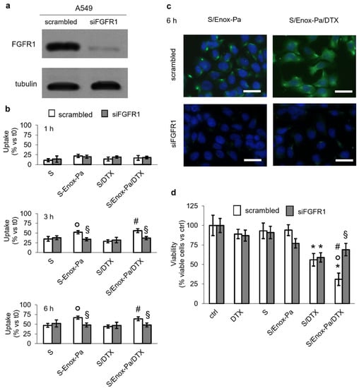 FGFR1 mediates uptake and cytotoxicity of Enox-coated SEDDS containing DTX. A549 cells were treated for 48 h with a non-targeting siRNA (scrambled) or with a pool of three siRNAs targeting FGFR1 (siFGFR1), then subjected to the following investigations. (a) Immunoblot of the indicated proteins. Tubulin was used as control of equal protein loading. The image is representative of one out of three experiments. (b) Cells were incubated for 1, 3, or 6 h with 0.25% v/v blank SEDDS (S), Enox-coated SEDDS (S/Enox-Pa), SEDDS containing DTX (80 µM final concentration; S/DTX), Enox-coated SEDDS containing DTX (80 µM final concentration; S/Enox-Pa/DTX). The intracellular fluorescence was measured in duplicates and compared to the fluorescence of the solution of each SEEDs before incubation (t0). The results, expressed as % of intracellular fluorescence versus fluorescence at t0, are presented as means ± SD (n = 3). ° p < 0.01: S/Enox-Pa vs. S; # p < 0.01: S/Enox-Pa/DTX vs. S/DTX; § p < 0.05: siFGFR1 vs. scrambled cells. (c) Representative photographs of scrambled and siFGFR1 A549 cells treated for 6 h with S-E and S-E-d, as in (b). The photos are representative of one out of three experiments. For each experimental condition, a minimum of five fields were examined. The photos are representative of one out of three experiments. Ocular: 10×; objective: 60×. Scale bar: 50 µm. (d) Cells were incubated with fresh medium (ctrl), 80 µM free docetaxel (DTX), 0.25% v/v blank SEDDs (S), Enox-coated SEDDS (S/Enox-Pa), SEDDS containing docetaxel (80 µM final concentration; S/DTX), and Enox-coated SEDDs containing docetaxel (80 µM final concentration; S/Enox-Pa/DTX) for 72 h. Cell viability was measured by a chemiluminescence-based assay in quadruplicates. Data are presented as means ± SD (n = 3). * p < 0.01: vs. ctrl; ° p < 0.01: S/Enox-Pa/DTX vs. DTX; # p < 0.001: S/Enox-Pa/DTX vs. S/DTX; § p < 0.001: siFGFR1 vs. scrambled cells.