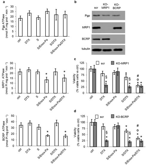 Enox-coated SEDDS inhibit MRP1 and BCRP activity. A459 cells were incubated for (a) 24 h or (c) 72 h with fresh medium (ctrl), 80 µM free docetaxel (DTX), 0.25% v/v blank SEDDS (S), Enox-coated SEDDS (S/Enox-Pa), SEDDs containing docetaxel (80 µM final concentration; S/DTX), and Enox-coated SEDDS containing docetaxel (80 µM final concentration; S/Enox-Pa/DTX). (a) The rate of ATP hydrolysis by immunopurified Pgp, MRP1, or BCRP extracted from cells treated as reported above was measured by spectrophotometric analysis in triplicates. Data are presented as means + SD (n = 3). * p < 0.02: vs. ctrl. (b) A549 cells were transduced with a non-targeting (scrambled) CRISPR-Cas vector or with a CRISPR-Cas vector to knock-out (KO) MRP1 or BCRP. The indicated proteins were measured by immunoblotting. Tubulin was used as control of equal protein loading. The image is representative of one out of three experiments. (c,d) The viability of scrambled, KO MRP1, and KO BCRP A549 cells was measured by a chemiluminescence-based assay in quadruplicates. Data are presented as means + SD (n = 3). * p < 0.001: vs. ctrl; ° p < 0.001: S/Enox-Pa/DTX vs. DTX; # p < 0.01: S/Enox-Pa/DTX vs. S/DTX; § p < 0.001: KO vs. scrambled cells.