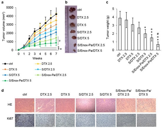 Finally, we validated the anti-tumor efficacy and the safety profile of S/Enox-Pa/DTX in A549 xenografts. Mice were treated with two different dosages of free DTX—2.5 and 5 mg kg−1—which have been reported to be moderately effective in this experimental model []. Free DTX reduced tumor growth in a dose-dependent manner, but these results were not significantly different from the control (animals treated with vehicle, Figure 4a). S/DTX and S/Enox-Pa/DTX—at the same dosage of DTX—also elicited a dose-dependent reduction of the tumor growth rate, which was more pronounced than the free drug. S/Enox-Pa/DTX were significantly more effective than DTX and S/DTX in terms of tumor growth rate (Figure 4a) and tumor volume (Figure 4b,c). In agreement with the decreased proliferation observed in vitro, the intratumor proliferation, measured as positivity to Ki67, was reduced in this order: DTX<S/DTX<S/Enox-Pa/DTX (Figure 4d).