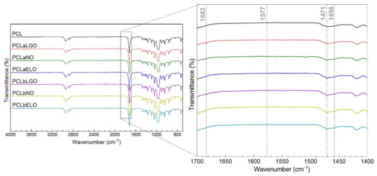 ATR-FTIR spectra of the PCL, PCLaEOs and PCLbEOs mats collected between 4000–700 cm−1. As the most significant for this study, the section between 1700–1400 cm−1 was amplified.