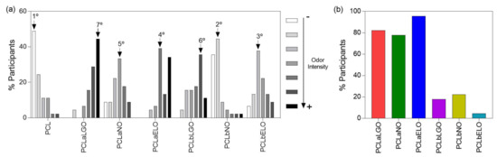 In a first approach, participants were requested to organize the seven samples in the study by order of odor intensity. Of these, 48.9% of participants placed PCL as the sample with the lowest odor intensity, while 44.4% selected PCLaLGO as the highest (Figure 3a), which corroborates the results from Table 4. Yet, when comparing odor intensity between groups of samples treated with the same EOs but loaded with different strategies, more than ≈75% of the participants determined the absorbed samples as the ones with the most intense smell (Figure 3b). Considering the sensory information was collected during only a few minutes of testing (<10 min) and that GC-MS spectra averaged accumulated data of a 4 h period, it is likely that EOs release from PCLaNO and PCLaELO was more important during the first instances of use and to fade away overtime. Finally, participants were requested to evaluate the mats by the pleasantness of smell. PCLbLGO was selected as the most pleasant of the group. PCLaLGO also gathered very positive feedback; however, some participants complained about the overwhelming odor and 4.4% of the those even said it was unpleasant. PCLaELO was categorized as extremely unpleasant or unpleasant by 80% of the participants.
