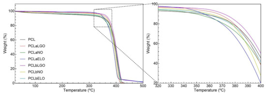 Polymer-related degradation steps of unloaded and EOs-loaded PCL fibers were revealed via TGA (Figure 4) as the temperature increased.